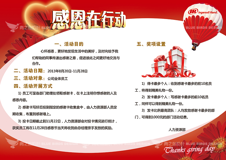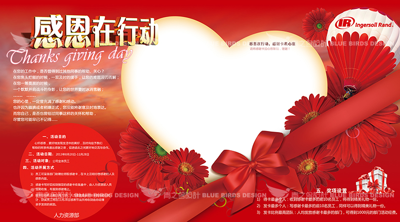 英格索蘭(Ingersoll Rand)總部設(shè)在美國,是一個多品牌產(chǎn)品的制造型世界500強企業(yè)。作為一個世界級的公司,英格索蘭非常注重可持續(xù)性發(fā)展及員工的個人發(fā)展。公司內(nèi)部開展了感恩活動,常州青之鳥為其設(shè)計了感恩活動的海報及系列物品。